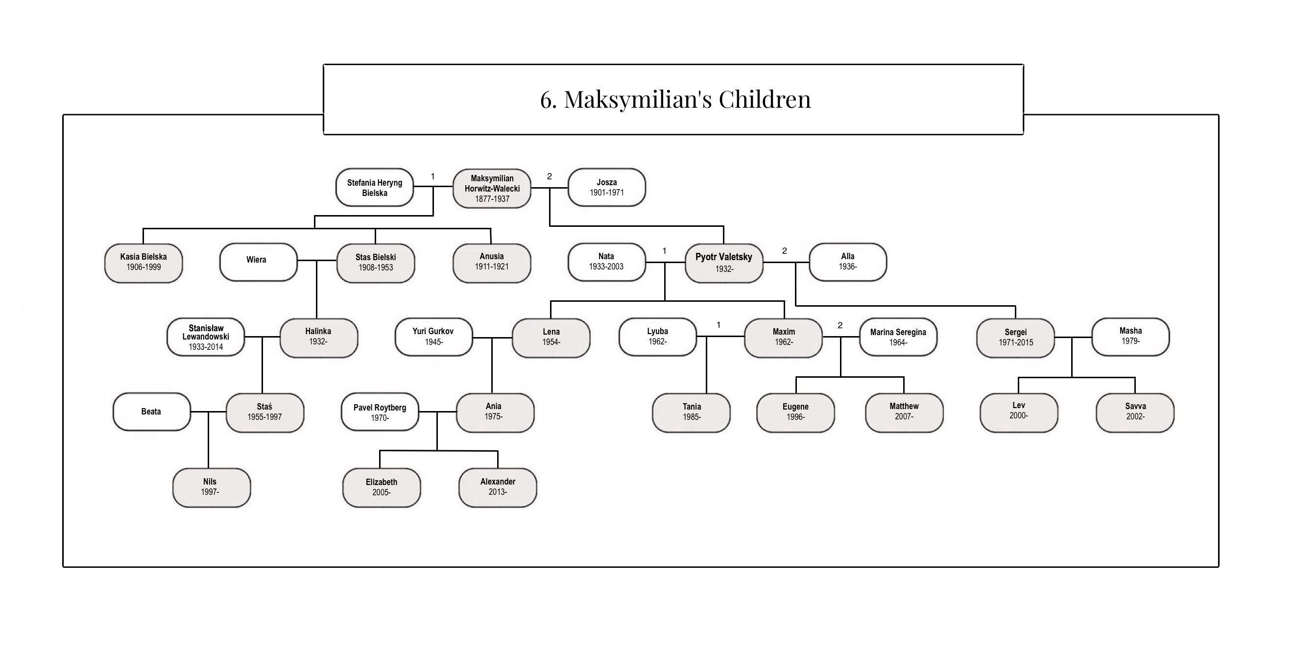Direct descendants of Gustav and Julia are indicated by shaded boxes, relatives by marriage by unshaded boxes.